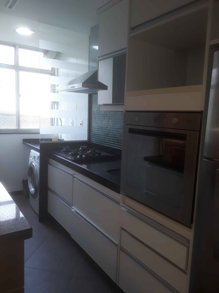 Cozinha com moveis planejados, forno e fogão cooktop 4 bocas, exaustor com coifa e iluminação embutida, divisória para área de serviço de blidex.